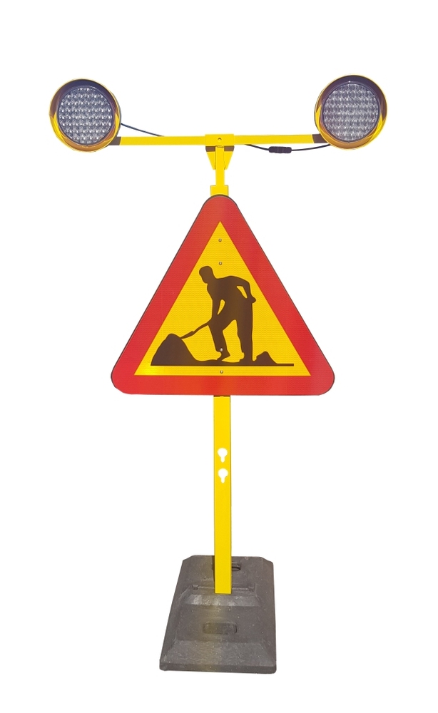 Ett stativ som kombinerar säkerhet, flexibilitet och smart design – med förvarningsljus och nyckelhålsfästen för enkel skyltmontering.